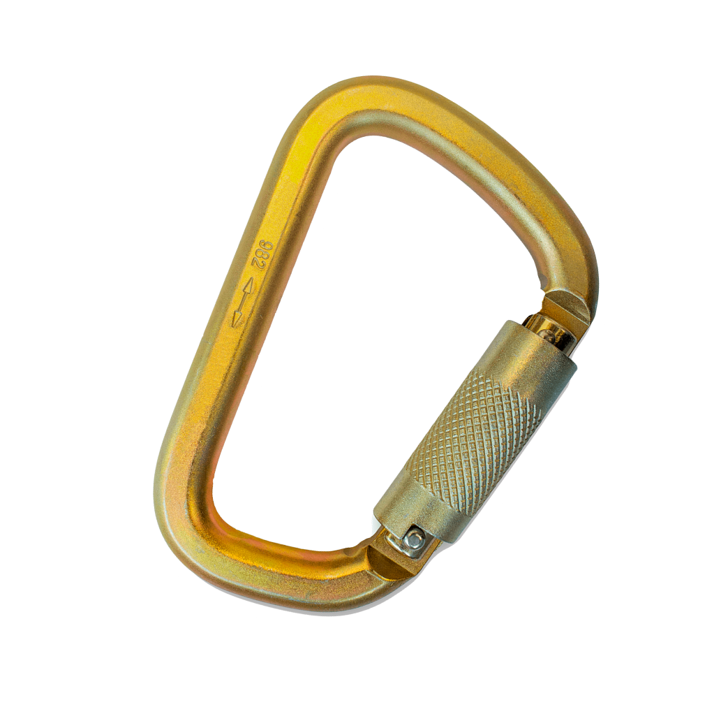 Mosqueton de acero Steelsafe 982, asimetrico, con seguro giratorio y 22 mm de apertura, identificado con numero de serie.