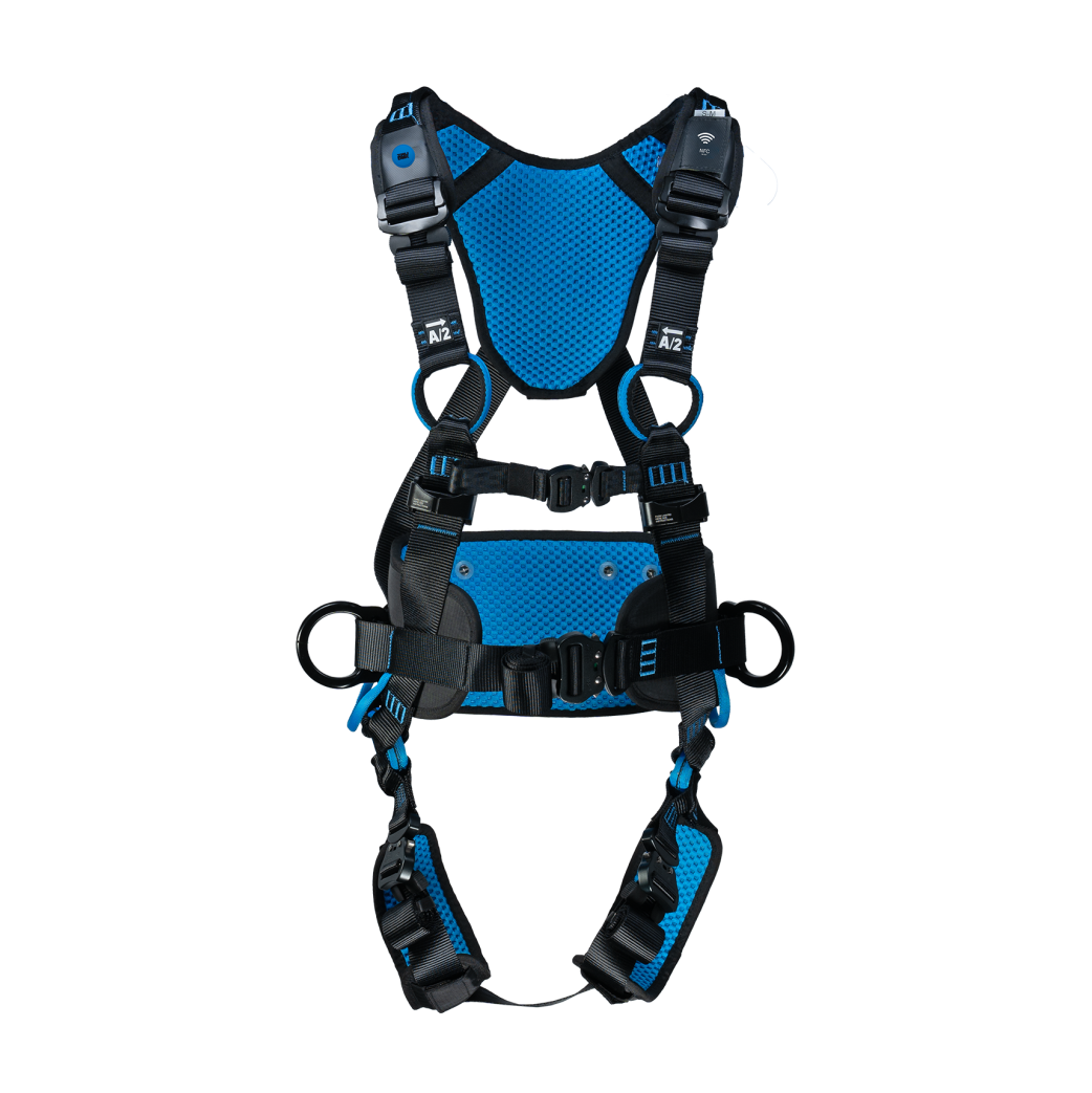 Arnes acojinado en espalda y pierneras con 3 anillos de aluminio; 1 dorsal y 2 a los costados mas 2 textiles al pecho.