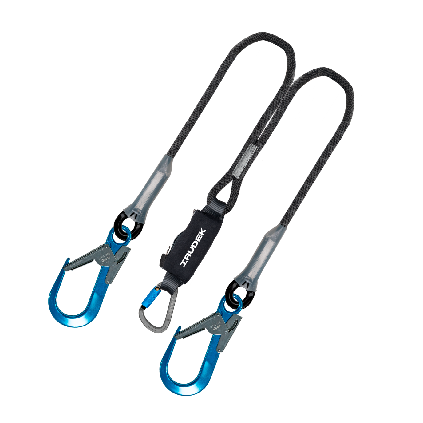 Eslinga contra caidas doble brazo, cuerda de poliamida, gancho grande y mosqueton ambos de aluminio.