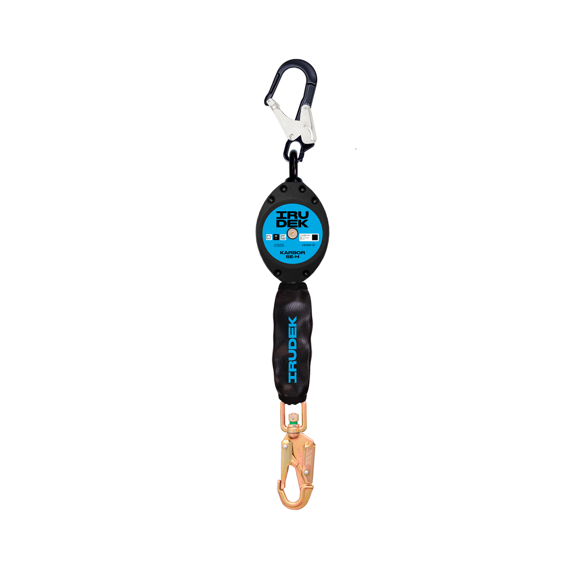 Línea retráctil de cinta con absorbedor exterior, Gancho conector superior grande y gancho inferior indicador de impacto.